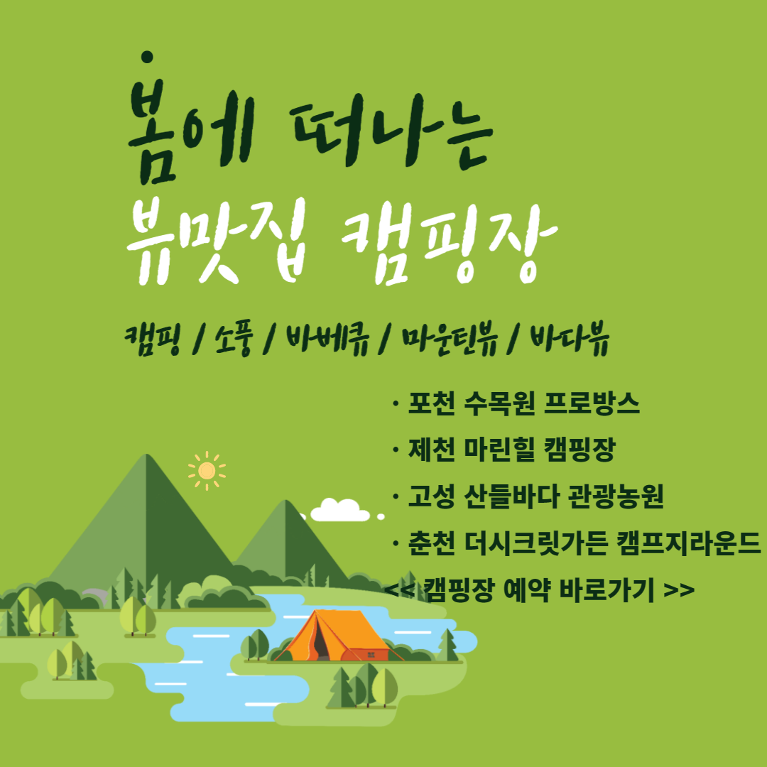 | 봄에 떠나기 좋은 뷰 맛집 캠핑장4군데를 소개해 드리려고 합니다. 마운틴뷰와 바다뷰가 너무 이쁜 캠핑장입니다. 포천 수목원 프로방스, 제천 마린힐 캠핑장, 고성 산들바다 관광농원, 춘천 더시크릿가든 캠프지라운드 캠핑장의 정보와 예약하는 방법에 대해서 설명해 드릴테니 여기에서 편안하게 예약하시고 즐거운 여행 하시길 바랍니다. |