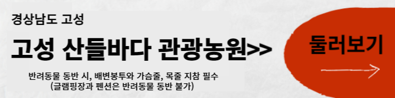 경상남도 고성 산들바다 관광농원은 푸른 남해가 보이는 언덕 위에 위치해 있는 캠핑장입니다. 바다뷰와 마운틴뷰의 환상적인 조화와 일출과 일몰이 무척 아름다운 캠핑지입니다. 펜션과 글램핑장, 카라반도 이용할 수 있으며 카페, 수영장, 야외공연장 등등 다양한 부대시설이 있어 사계절 내내 다채롭게 즐길 수 있는 곳입니다. 가족들과 지인들 특히 아이들이 있다면 캠핑장 주변에는 고성공룡 박물관과 당항포, 사량도, 상족암 군립공원 등이 있으니 관광투어로도 손색이 없는 캠핑장입니다.